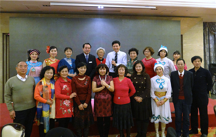 天津國商人集團黨支部書記、董事長林谷春、總經理趙清立與水之聲藝術團合影