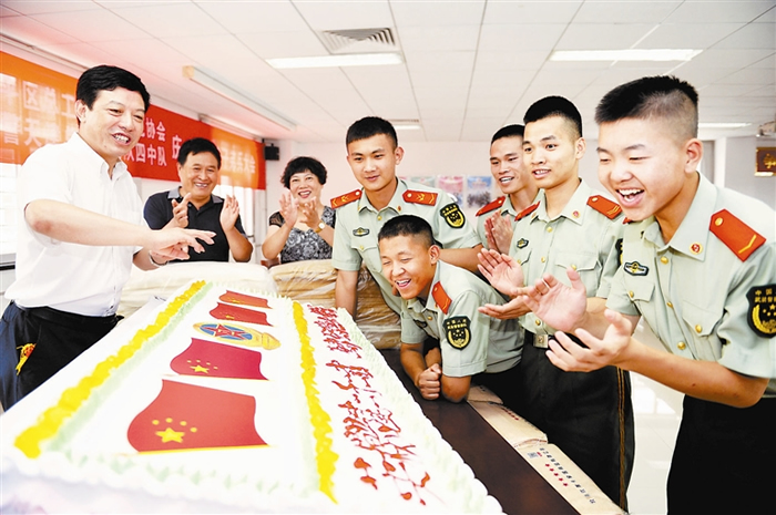 今天是“八一”建軍節,和平區勞動模范林谷春同志等代表勞模協會來到武警天津總隊第二支隊四中隊慰問子弟兵,為戰士們送去特制的巨型蛋糕、洗衣機和生活用品。