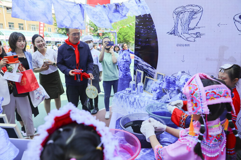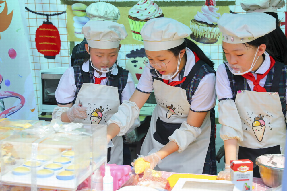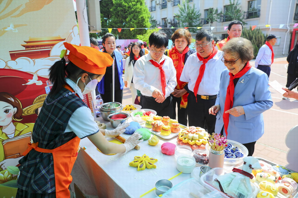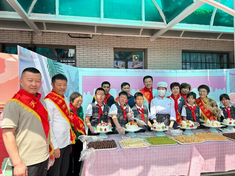 在勞動風采展示中,全國勞動模范趙嘉祥展示制作了狗不理包子;天津市勞動模范韓志永與老美華鞋業有限公司骨干隊伍展示非遺產品“盤扣”;天津市勞動模范王鐵江技師展示插花技藝及鮮花的培植與養護;天津市勞動模范、天津萃格蛋糕總店曹鳳林總經理帶領團隊展示蛋糕裱花,并向學生們贈送祝愿同學們六一兒童節快樂的禮品大蛋糕......在王希萍校長陪同下,領導和嘉賓們參觀各年級勞動風采展示臺。